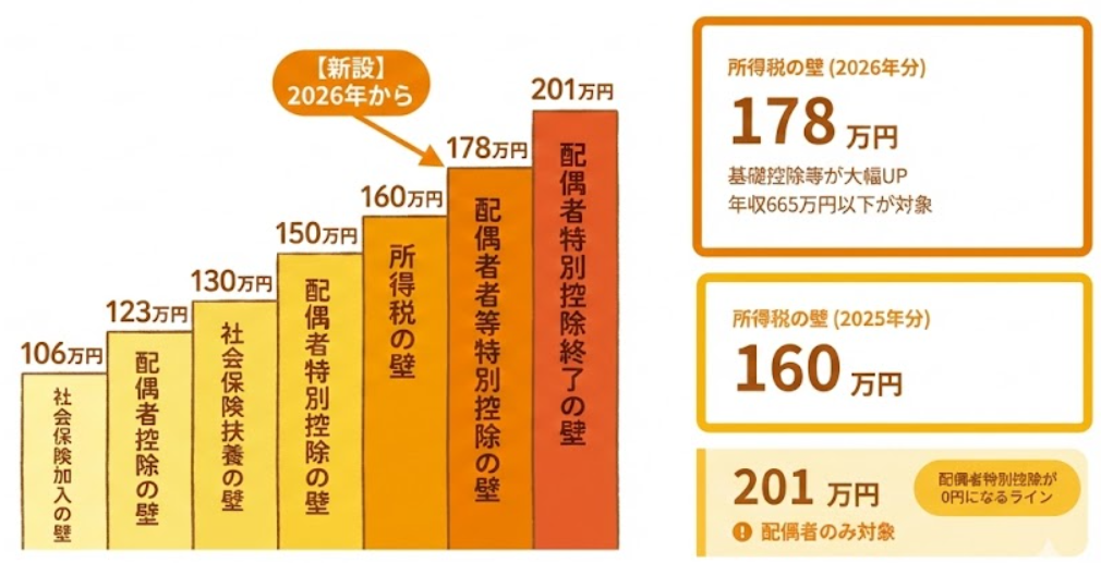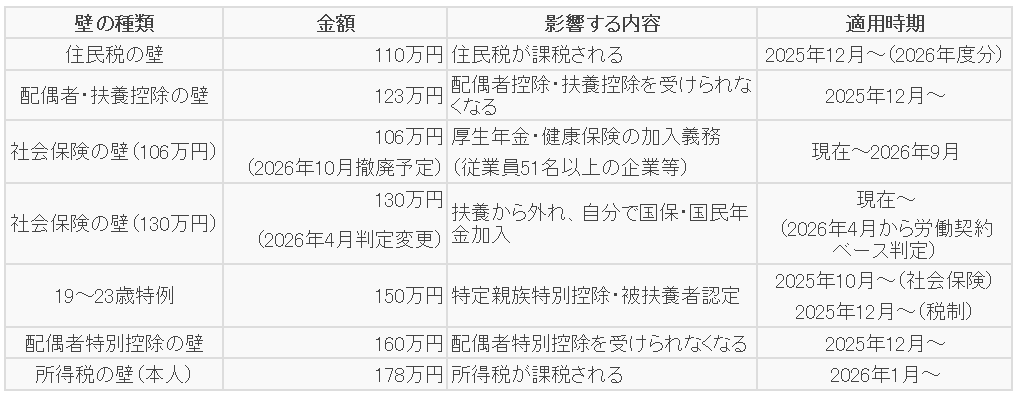178万円の壁が引き上げられても、他の「壁」は据え置きされています。パートやアルバイトで働く際には、以下の壁にも注意が必要です。